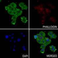 Immunofluorescent analysis of ARHGEF10 staining in Hela cells. Formalin-fixed cells were permeabilized with 0.1% Triton X-100 in TBS for 5-10 minutes and blocked with 3% BSA-PBS for 30 minutes at room temperature. Cells were probed with the primary antibody in 3% BSA-PBS and incubated overnight at 4 °C in a hidified chamber. Cells were washed with PBST and incubated with a AF488-conjugated secondary antibody (green) in PBS at room temperature in the dark. Phalloidin - AF594 was used to stain Actin filaments (red). DAPI was used to stain the cell nuclei (blue).