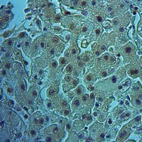 Immunohistochemical analysis of GFR staining in human liver cancer formalin fixed paraffin embedded tissue section. The section was pre-treated using heat mediated antigen retrieval with sodium citrate buffer (pH 6.0). The section was then incubated with the antibody at room temperature and detected using an HRP conjugated compact polymer system. DAB was used as the chromogen. The section was then counterstained with haematoxylin and mounted with DPX.