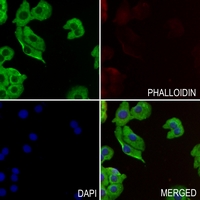 Immunofluorescent analysis of ELMO1 staining in Hela cells. Formalin-fixed cells were permeabilized with 0.1% Triton X-100 in TBS for 5-10 minutes and blocked with 3% BSA-PBS for 30 minutes at room temperature. Cells were probed with the primary antibody in 3% BSA-PBS and incubated overnight at 4 °C in a hidified chamber. Cells were washed with PBST and incubated with a AF488-conjugated secondary antibody (green) in PBS at room temperature in the dark. Phalloidin - AF594 was used to stain Actin filaments (red). DAPI was used to stain the cell nuclei (blue).