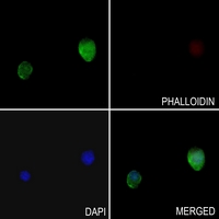 Immunofluorescent analysis of TLK1 staining in VB2 cells. Formalin-fixed cells were permeabilized with 0.1% Triton X-100 in TBS for 5-10 minutes and blocked with 3% BSA-PBS for 30 minutes at room temperature. Cells were probed with the primary antibody in 3% BSA-PBS and incubated overnight at 4 °C in a hidified chamber. Cells were washed with PBST and incubated with a AF488-conjugated secondary antibody (green) in PBS at room temperature in the dark. Phalloidin - AF594 was used to stain Actin filaments (red). DAPI was used to stain the cell nuclei (blue).