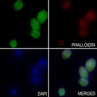 Immunofluorescent analysis of ZC3H11A staining in VB2 cells. Formalin-fixed cells were permeabilized with 0.1% Triton X-100 in TBS for 5-10 minutes and blocked with 3% BSA-PBS for 30 minutes at room temperature. Cells were probed with the primary antibody in 3% BSA-PBS and incubated overnight at 4 °C in a hidified chamber. Cells were washed with PBST and incubated with a AF488-conjugated secondary antibody (green) in PBS at room temperature in the dark. Phalloidin - AF594 was used to stain Actin filaments (red). DAPI was used to stain the cell nuclei (blue).