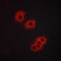 Immunofluorescent analysis of GPR105 staining in MCF7 cells. Formalin-fixed cells were permeabilized with 0.1% Triton X-100 in TBS for 5-10 minutes and blocked with 3% BSA-PBS for 30 minutes at room temperature. Cells were probed with the primary antibody in 3% BSA-PBS and incubated overnight at 4 °C in a hidified chamber. Cells were washed with PBST and incubated with a AF594-conjugated secondary antibody (red) in PBS at room temperature in the dark.