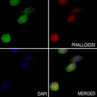 Immunofluorescent analysis of ABI1 staining in VB2 cells. Formalin-fixed cells were permeabilized with 0.1% Triton X-100 in TBS for 5-10 minutes and blocked with 3% BSA-PBS for 30 minutes at room temperature. Cells were probed with the primary antibody in 3% BSA-PBS and incubated overnight at 4 °C in a hidified chamber. Cells were washed with PBST and incubated with a AF488-conjugated secondary antibody (green) in PBS at room temperature in the dark. Phalloidin - AF594 was used to stain Actin filaments (red). DAPI was used to stain the cell nuclei (blue).