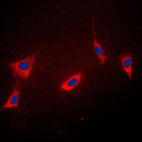 Immunofluorescent analysis of Cyclophilin F staining in K562 cells. Formalin-fixed cells were permeabilized with 0.1% Triton X-100 in TBS for 5-10 minutes and blocked with 3% BSA-PBS for 30 minutes at room temperature. Cells were probed with the primary antibody in 3% BSA-PBS and incubated overnight at 4 °C in a humidified chamber. Cells were washed with PBST and incubated with a DyLight 594-conjugated secondary antibody (red) in PBS at room temperature in the dark. DAPI was used to stain the cell nuclei (blue).
