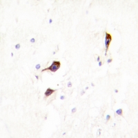 Immunohistochemical analysis of Cyclophilin F staining in human brain formalin fixed paraffin embedded tissue section. The section was pre-treated using heat mediated antigen retrieval with sodium citrate buffer (pH 6.0). The section was then incubated with the antibody at room temperature and detected using an HRP conjugated compact polymer system. DAB was used as the chromogen. The section was then counterstained with haematoxylin and mounted with DPX. -