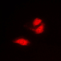 Immunofluorescent analysis of G3BP1 staining in A549 cells. Formalin-fixed cells were permeabilized with 0.1% Triton X-100 in TBS for 5-10 minutes and blocked with 3% BSA-PBS for 30 minutes at room temperature. Cells were probed with the primary antibody in 3% BSA-PBS and incubated overnight at 4 °C in a humidified chamber. Cells were washed with PBST and incubated with a DyLight 594-conjugated secondary antibody (red) in PBS at room temperature in the dark.