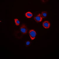 Immunofluorescent analysis of Renin Receptor staining in Raw264.7 cells. Formalin-fixed cells were permeabilized with 0.1% Triton X-100 in TBS for 5-10 minutes and blocked with 3% BSA-PBS for 30 minutes at room temperature. Cells were probed with the primary antibody in 3% BSA-PBS and incubated overnight at 4 °C in a humidified chamber. Cells were washed with PBST and incubated with a DyLight 594-conjugated secondary antibody (red) in PBS at room temperature in the dark. DAPI was used to stain the cell nuclei (blue).