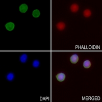 Immunofluorescent analysis of KCNMB2 staining in BV2 cells. Formalin-fixed cells were permeabilized with 0.1% Triton X-100 in TBS for 5-10 minutes and blocked with 3% BSA-PBS for 30 minutes at room temperature. Cells were probed with the primary antibody in 3% BSA-PBS and incubated overnight at 4 °C in a hidified chamber. Cells were washed with PBST and incubated with a AF488-conjugated secondary antibody (green) in PBS at room temperature in the dark. Phalloidin - AF594 was used to stain Actin filaments (red). DAPI was used to stain the cell nuclei (blue).