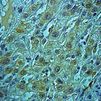 Immunohistochemical analysis of EPAC1 staining in human liver cancer formalin fixed paraffin embedded tissue section. The section was pre-treated using heat mediated antigen retrieval with sodium citrate buffer (pH 6.0). The section was then incubated with the antibody at room temperature and detected using an HRP conjugated compact polymer system. DAB was used as the chromogen. The section was then counterstained with haematoxylin and mounted with DPX.