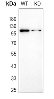 Western blot analysis of HSPH1 expression in wild type (WT) and knockdown (KD) HeLa cell lysates.