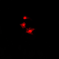 Immunofluorescent analysis of FAST Kinase staining in HL60 cells. Formalin-fixed cells were permeabilized with 0.1% Triton X-100 in TBS for 5-10 minutes and blocked with 3% BSA-PBS for 30 minutes at room temperature. Cells were probed with the primary antibody in 3% BSA-PBS and incubated overnight at 4 °C in a humidified chamber. Cells were washed with PBST and incubated with a DyLight 594-conjugated secondary antibody (red) in PBS at room temperature in the dark.