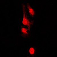 Immunofluorescent analysis of AKAP13 staining in HeLa cells. Formalin-fixed cells were permeabilized with 0.1% Triton X-100 in TBS for 5-10 minutes and blocked with 3% BSA-PBS for 30 minutes at room temperature. Cells were probed with the primary antibody in 3% BSA-PBS and incubated overnight at 4 °C in a humidified chamber. Cells were washed with PBST and incubated with a DyLight 594-conjugated secondary antibody (red) in PBS at room temperature in the dark.