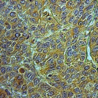 Immunohistochemical analysis of RASA3 staining in human liver cancer formalin fixed paraffin embedded tissue section. The section was pre-treated using heat mediated antigen retrieval with sodium citrate buffer (pH 6.0). The section was then incubated with the antibody at room temperature and detected using an HRP conjugated compact polymer system. DAB was used as the chromogen. The section was then counterstained with haematoxylin and mounted with DPX.