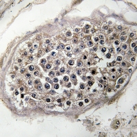 Immunohistochemical analysis of RAB3GAP1 staining in human testis formalin fixed paraffin embedded tissue section. The section was pre-treated using heat mediated antigen retrieval with sodium citrate buffer (pH 6.0). The section was then incubated with the antibody at room temperature and detected using an HRP conjugated compact polymer system. DAB was used as the chromogen. The section was then counterstained with haematoxylin and mounted with DPX.