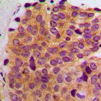 Immunohistochemical analysis of MAST2 staining in human breast cancer formalin fixed paraffin embedded tissue section. The section was pre-treated using heat mediated antigen retrieval with sodium citrate buffer (pH 6.0). The section was then incubated with the antibody at room temperature and detected using an HRP conjugated compact polymer system. DAB was used as the chromogen. The section was then counterstained with haematoxylin and mounted with DPX. -