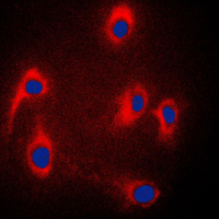 Immunofluorescent analysis of JIP3 staining in PC12 cells. Formalin-fixed cells were permeabilized with 0.1% Triton X-100 in TBS for 5-10 minutes and blocked with 3% BSA-PBS for 30 minutes at room temperature. Cells were probed with the primary antibody in 3% BSA-PBS and incubated overnight at 4 °C in a humidified chamber. Cells were washed with PBST and incubated with a DyLight 594-conjugated secondary antibody (red) in PBS at room temperature in the dark. DAPI was used to stain the cell nuclei (blue).