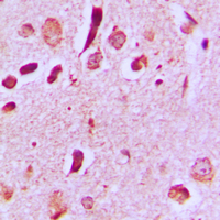 Immunohistochemical analysis of JIP3 staining in human brain formalin fixed paraffin embedded tissue section. The section was pre-treated using heat mediated antigen retrieval with sodium citrate buffer (pH 6.0). The section was then incubated with the antibody at room temperature and detected using an HRP conjugated compact polymer system. DAB was used as the chromogen. The section was then counterstained with haematoxylin and mounted with DPX. -
