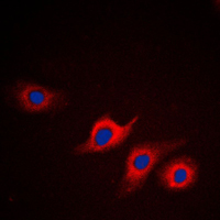 Immunofluorescent analysis of Apolipoprotein L2 staining in HepG2 cells. Formalin-fixed cells were permeabilized with 0.1% Triton X-100 in TBS for 5-10 minutes and blocked with 3% BSA-PBS for 30 minutes at room temperature. Cells were probed with the primary antibody in 3% BSA-PBS and incubated overnight at 4 °C in a humidified chamber. Cells were washed with PBST and incubated with a DyLight 594-conjugated secondary antibody (red) in PBS at room temperature in the dark. DAPI was used to stain the cell nuclei (blue).