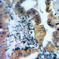 Immunohistochemical analysis of Ataxin 10 staining in human colorectal cancer formalin fixed paraffin embedded tissue section. The section was pre-treated using heat mediated antigen retrieval with sodium citrate buffer (pH 6.0). The section was then incubated with the antibody at room temperature and detected using an HRP conjugated compact polymer system. DAB was used as the chromogen. The section was then counterstained with haematoxylin and mounted with DPX.
