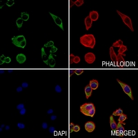 Immunofluorescent analysis of CD318 staining in MCF7 cells. Formalin-fixed cells were permeabilized with 0.1% Triton X-100 in TBS for 5-10 minutes and blocked with 3% BSA-PBS for 30 minutes at room temperature. Cells were probed with the primary antibody in 3% BSA-PBS and incubated overnight at 4 °C in a hidified chamber. Cells were washed with PBST and incubated with a AF488-conjugated secondary antibody (green) in PBS at room temperature in the dark. Phalloidin - AF594 was used to stain Actin filaments (red). DAPI was used to stain the cell nuclei (blue).