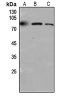 Western blot analysis of CD318 expression in Hela (A), mouse kidney (B), rat lung (C) whole cell lysates. (Predicted band size: 92 kD; Observed band size: 80 kD) -