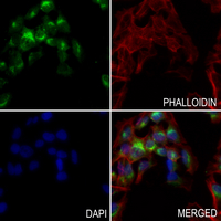 Immunofluorescent analysis of CEP41 staining in HuH7 cells. Formalin-fixed cells were permeabilized with 0.1% Triton X-100 in TBS for 5-10 minutes and blocked with 3% BSA-PBS for 30 minutes at room temperature. Cells were probed with the primary antibody in 3% BSA-PBS and incubated overnight at 4 °C in a hidified chamber. Cells were washed with PBST and incubated with a AF488-conjugated secondary antibody (green) in PBS at room temperature in the dark. Phalloidin - AF594 was used to stain Actin filaments (red). DAPI was used to stain the cell nuclei (blue).