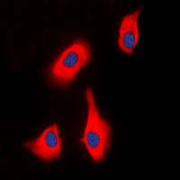 Immunofluorescent analysis of PTHR1 staining in HEK293T cells. Formalin-fixed cells were permeabilized with 0.1% Triton X-100 in TBS for 5-10 minutes and blocked with 3% BSA-PBS for 30 minutes at room temperature. Cells were probed with the primary antibody in 3% BSA-PBS and incubated overnight at 4 °C in a hidified chamber. Cells were washed with PBST and incubated with a DyLight 594-conjugated secondary antibody (red) in PBS at room temperature in the dark. DAPI was used to stain the cell nuclei (blue).