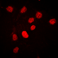 Immunofluorescent analysis of C/EBP beta (Phospho-T235) staining in HEK293T cells. Formalin-fixed cells were permeabilized with 0.1% Triton X-100 in TBS for 5-10 minutes and blocked with 3% BSA-PBS for 30 minutes at room temperature. Cells were probed with the primary antibody in 3% BSA-PBS and incubated overnight at 4 °C in a hidified chamber. Cells were washed with PBST and incubated with a DyLight 594-conjugated secondary antibody (red) in PBS at room temperature in the dark.