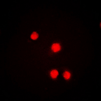 Immunofluorescent analysis of ROR alpha staining in HeLa cells. Formalin-fixed cells were permeabilized with 0.1% Triton X-100 in TBS for 5-10 minutes and blocked with 3% BSA-PBS for 30 minutes at room temperature. Cells were probed with the primary antibody in 3% BSA-PBS and incubated overnight at 4 °C in a hidified chamber. Cells were washed with PBST and incubated with a DyLight 594-conjugated secondary antibody (red) in PBS at room temperature in the dark.