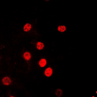 Immunofluorescent analysis of RPA2 (Phospho-T21) staining in HeLa cells. Formalin-fixed cells were permeabilized with 0.1% Triton X-100 in TBS for 5-10 minutes and blocked with 3% BSA-PBS for 30 minutes at room temperature. Cells were probed with the primary antibody in 3% BSA-PBS and incubated overnight at 4 °C in a hidified chamber. Cells were washed with PBST and incubated with a DyLight 594-conjugated secondary antibody (red) in PBS at room temperature in the dark.