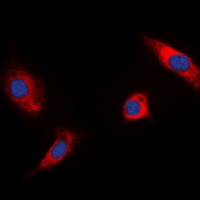 Immunofluorescent analysis of RSK1/2/3 (Phospho-T573/570/577) staining in HeLa cells. Formalin-fixed cells were permeabilized with 0.1% Triton X-100 in TBS for 5-10 minutes and blocked with 3% BSA-PBS for 30 minutes at room temperature. Cells were probed with the primary antibody in 3% BSA-PBS and incubated overnight at 4 °C in a hidified chamber. Cells were washed with PBST and incubated with a DyLight 594-conjugated secondary antibody (red) in PBS at room temperature in the dark. DAPI was used to stain the cell nuclei (blue).