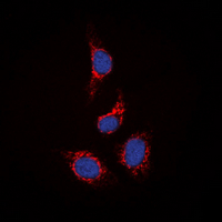 Immunofluorescent analysis of STAM2 staining in HepG2 cells. Formalin-fixed cells were permeabilized with 0.1% Triton X-100 in TBS for 5-10 minutes and blocked with 3% BSA-PBS for 30 minutes at room temperature. Cells were probed with the primary antibody in 3% BSA-PBS and incubated overnight at 4 °C in a hidified chamber. Cells were washed with PBST and incubated with a DyLight 594-conjugated secondary antibody (red) in PBS at room temperature in the dark. DAPI was used to stain the cell nuclei (blue).