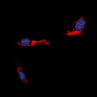 Immunofluorescent analysis of STEAP4 staining in Jurkat cells. Formalin-fixed cells were permeabilized with 0.1% Triton X-100 in TBS for 5-10 minutes and blocked with 3% BSA-PBS for 30 minutes at room temperature. Cells were probed with the primary antibody in 3% BSA-PBS and incubated overnight at 4 °C in a hidified chamber. Cells were washed with PBST and incubated with a DyLight 594-conjugated secondary antibody (red) in PBS at room temperature in the dark. DAPI was used to stain the cell nuclei (blue).