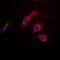 Immunofluorescent analysis of AS160 staining in HeLa cells. Formalin-fixed cells were permeabilized with 0.1% Triton X-100 in TBS for 5-10 minutes and blocked with 3% BSA-PBS for 30 minutes at room temperature. Cells were probed with the primary antibody in 3% BSA-PBS and incubated overnight at 4 °C in a hidified chamber. Cells were washed with PBST and incubated with a DyLight 594-conjugated secondary antibody (red) in PBS at room temperature in the dark. DAPI was used to stain the cell nuclei (blue).