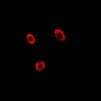 Immunofluorescent analysis of Contactin 4 staining in A549 cells. Formalin-fixed cells were permeabilized with 0.1% Triton X-100 in TBS for 5-10 minutes and blocked with 3% BSA-PBS for 30 minutes at room temperature. Cells were probed with the primary antibody in 3% BSA-PBS and incubated overnight at 4 °C in a hidified chamber. Cells were washed with PBST and incubated with a Alexa Fluor 594-conjugated secondary antibody (red) in PBS at room temperature in the dark.
