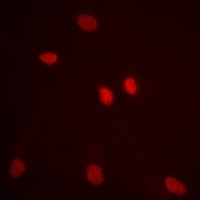 Immunofluorescent analysis of Histone H3 staining in HeLa cells. Formalin-fixed cells were permeabilized with 0.1% Triton X-100 in TBS for 5-10 minutes and blocked with 3% BSA-PBS for 30 minutes at room temperature. Cells were probed with the primary antibody in 3% BSA-PBS and incubated overnight at 4 °C in a hidified chamber. Cells were washed with PBST and incubated with a AF594-conjugated secondary antibody (red) in PBS at room temperature in the dark.