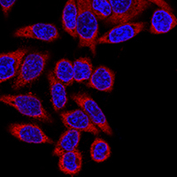 Immunofluorescent analysis of hES staining in HeLa cells. Formalin-fixed cells were permeabilized with 0.1% Triton X-100 in TBS for 5-10 minutes and blocked with 3% BSA-PBS for 30 minutes at room temperature. Cells were probed with the primary antibody in 3% BSA-PBS and incubated overnight at 4 °C in a humidified chamber. Cells were washed with PBST and incubated with a AF594-conjugated secondary antibody (red) in PBS at room temperature in the dark. DAPI was used to stain the cell nuclei (blue).