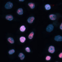 Immunofluorescent analysis of TET1 staining in HeLa cells. Formalin-fixed cells were permeabilized with 0.1% Triton X-100 in TBS for 5-10 minutes and blocked with 3% BSA-PBS for 30 minutes at room temperature. Cells were probed with the primary antibody in 3% BSA-PBS and incubated overnight at 4 °C in a humidified chamber. Cells were washed with PBST and incubated with a AF594-conjugated secondary antibody (red) in PBS at room temperature in the dark. DAPI was used to stain the cell nuclei (blue).