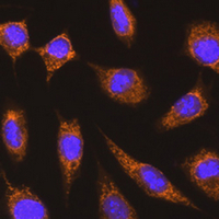 Immunofluorescent analysis of KNG1 staining in L929 cells. Formalin-fixed cells were permeabilized with 0.1% Triton X-100 in TBS for 5-10 minutes and blocked with 3% BSA-PBS for 30 minutes at room temperature. Cells were probed with the primary antibody in 3% BSA-PBS and incubated overnight at 4 °C in a humidified chamber. Cells were washed with PBST and incubated with a AF594-conjugated secondary antibody (red) in PBS at room temperature in the dark. DAPI was used to stain the cell nuclei (blue).