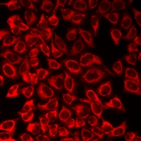 Immunofluorescent analysis of OCTN2 staining in MCF7 cells. Formalin-fixed cells were permeabilized with 0.1% Triton X-100 in TBS for 5-10 minutes and blocked with 3% BSA-PBS for 30 minutes at room temperature. Cells were probed with the primary antibody in 3% BSA-PBS and incubated overnight at 4 °C in a humidified chamber. Cells were washed with PBST and incubated with a DyLight 594-conjugated secondary antibody (red) in PBS at room temperature in the dark.