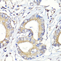 Immunohistochemical analysis of HBEGF staining in human colon cancer formalin fixed paraffin embedded tissue section. The section was pre-treated using heat mediated antigen retrieval with sodium citrate buffer (pH 6.0). The section was then incubated with the antibody at room temperature and detected using an HRP conjugated compact polymer system. DAB was used as the chromogen. The section was then counterstained with haematoxylin and mounted with DPX.