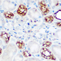 Immunohistochemical analysis of Calpain 2 staining in mouse kidney formalin fixed paraffin embedded tissue section. The section was pre-treated using heat mediated antigen retrieval with sodium citrate buffer (pH 6.0). The section was then incubated with the antibody at room temperature and detected using an HRP conjugated compact polymer system. DAB was used as the chromogen. The section was then counterstained with haematoxylin and mounted with DPX.