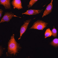 Immunofluorescent analysis of EXT2 staining in L929 cells. Formalin-fixed cells were permeabilized with 0.1% Triton X-100 in TBS for 5-10 minutes and blocked with 3% BSA-PBS for 30 minutes at room temperature. Cells were probed with the primary antibody in 3% BSA-PBS and incubated overnight at 4 °C in a humidified chamber. Cells were washed with PBST and incubated with a AF594-conjugated secondary antibody (red) in PBS at room temperature in the dark. DAPI was used to stain the cell nuclei (blue).