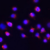 Immunofluorescent analysis of ACVR2A staining in A431 cells. Formalin-fixed cells were permeabilized with 0.1% Triton X-100 in TBS for 5-10 minutes and blocked with 3% BSA-PBS for 30 minutes at room temperature. Cells were probed with the primary antibody in 3% BSA-PBS and incubated overnight at 4 °C in a humidified chamber. Cells were washed with PBST and incubated with a AF594-conjugated secondary antibody (red) in PBS at room temperature in the dark. DAPI was used to stain the cell nuclei (blue).