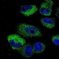 Immunofluorescent analysis of IL-13 staining in Jurkat cells. Formalin-fixed cells were permeabilized with 0.1% Triton X-100 in TBS for 5-10 minutes and blocked with 3% BSA-PBS for 30 minutes at room temperature. Cells were probed with the primary antibody in 3% BSA-PBS and incubated overnight at 4 °C in a humidified chamber. Cells were washed with PBST and incubated with a AF488-conjugated secondary antibody (green) in PBS at room temperature in the dark. DAPI was used to stain the cell nuclei (blue).