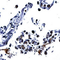 Immunohistochemical analysis of IL-13 staining in human lung formalin fixed paraffin embedded tissue section. The section was pre-treated using heat mediated antigen retrieval with sodium citrate buffer (pH 6.0). The section was then incubated with the antibody at room temperature and detected using an HRP conjugated compact polymer system. DAB was used as the chromogen. The section was then counterstained with haematoxylin and mounted with DPX. -