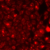 Immunofluorescent analysis of NGAL staining in A549 cells. Formalin-fixed cells were permeabilized with 0.1% Triton X-100 in TBS for 5-10 minutes and blocked with 3% BSA-PBS for 30 minutes at room temperature. Cells were probed with the primary antibody in 3% BSA-PBS and incubated overnight at 4 °C in a humidified chamber. Cells were washed with PBST and incubated with a DyLight 594-conjugated secondary antibody (red) in PBS at room temperature in the dark.
