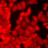 Immunofluorescent analysis of REG3 alpha staining in MCF7 cells. Formalin-fixed cells were permeabilized with 0.1% Triton X-100 in TBS for 5-10 minutes and blocked with 3% BSA-PBS for 30 minutes at room temperature. Cells were probed with the primary antibody in 3% BSA-PBS and incubated overnight at 4 °C in a humidified chamber. Cells were washed with PBST and incubated with a DyLight 594-conjugated secondary antibody (red) in PBS at room temperature in the dark.
