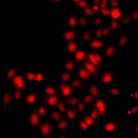 Immunofluorescent analysis of Histone H3 (MonoMethyl-K9) staining in HEK293T cells. Formalin-fixed cells were permeabilized with 0.1% Triton X-100 in TBS for 5-10 minutes and blocked with 3% BSA-PBS for 30 minutes at room temperature. Cells were probed with the primary antibody in 3% BSA-PBS and incubated overnight at 4 °C in a humidified chamber. Cells were washed with PBST and incubated with a DyLight 594-conjugated secondary antibody (red) in PBS at room temperature in the dark.