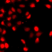 Immunofluorescent analysis of Histone H3 (DiMethyl-K79) staining in HEK293T cells. Formalin-fixed cells were permeabilized with 0.1% Triton X-100 in TBS for 5-10 minutes and blocked with 3% BSA-PBS for 30 minutes at room temperature. Cells were probed with the primary antibody in 3% BSA-PBS and incubated overnight at 4 °C in a humidified chamber. Cells were washed with PBST and incubated with a DyLight 594-conjugated secondary antibody (red) in PBS at room temperature in the dark.